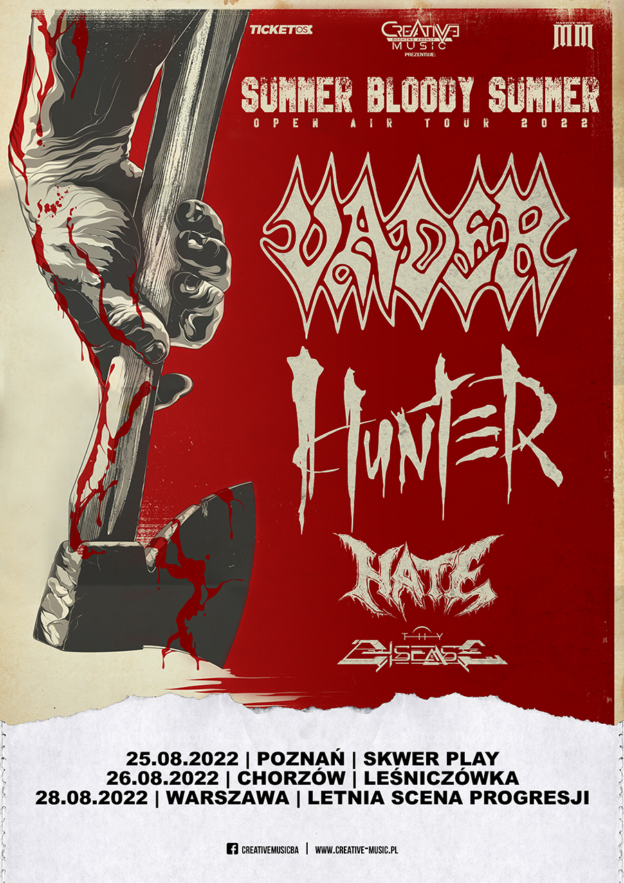 Na zakończenie tegorocznych wakacji czołowi przedstawiciele polskiej sceny metalowej VADER oraz HUNTER połączą siły i wystąpią na trzech koncertach plenerowych w Polsce! Towarzyszyć im będą również załogi HATE i THY DISEASE, mający już za sobą wspólne koncerty w tym roku.