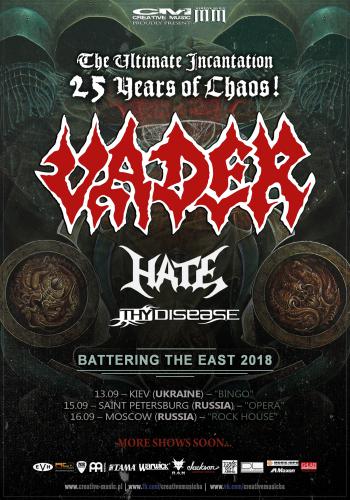 VADER will be accompanied by two other bands from Poland: death/black metal crusaders HATE promoting their latest release “Tremendum” and industrial groove metallers THY DISEASE promoting their newest forthcoming album.