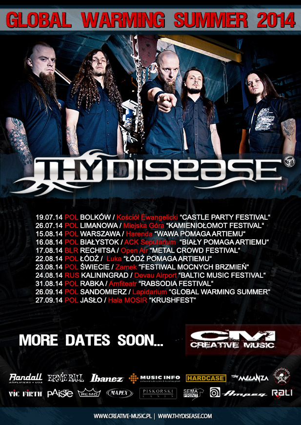 Już w tym tygodniu, a konkretnie w sobotę 19.07.2014 na Castle Party w Bolkowie THY DISEASE rozpocznie sezon letnich festiwali! Będzie to cykl koncertów pod hasłem GLOBAL WARMING SUMMER TOUR 2014, których zakończenie będzie miało miejsce 27.09.2014 na imprezie KRUSHFEST u boku Vader , Vesania oraz Krusher.