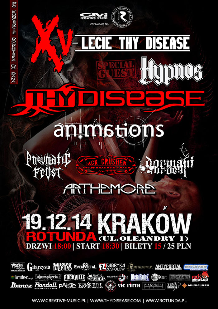 Zapowiada się niesamowity wieczór, oprócz Thy Disease na deskach krakowskiej Rotundy zagrają nasi przyjaciele: Animations, Pneumatic Frost, Dormant Ordeal , Jack Crusher, ARTHEMORE, a także gość specjalny wieczoru - czołowi przedstawiciele czeskiej sceny metalowej - Hypnos! Po koncercie odbędzie się oczywiście afterparty - rockoteka do rana!